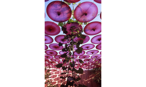 Nous sommes dans un concentré enclos d'une nature rêvée, qu'il est possible d'expérimenter à notre échelle pour sentir, ressentir, parcourir nos propres émotions, celles qui nous étreignent devant le rouge flamboyant d' un coucher de soleil, du pourpre inquiétant d'un nuage, de la rousseur d'une lune ou du bleu sombre d'un crépuscule L'expérience proposée au visiteur pourrait être décrite comme un voyage à l'intérieur d'un vase où se mêlent les éléments du végétal, de l'aquatique et de la coloration venant de l'extérieur. Le visiteur devient lui-même le capteur de ce monde en miniature, il n'est pas le spectateur d'un objet ou d'une installation mais l'habitant, il est inclus dans la proposition de ces trois mondes colorés. L'enclos jaune avec son arbre artificiel duquel émerge une liane plantée de végétaux entraîne à un espace de jungle avec courbes, entrelacs et voussures. L' enclos rouge lie la terre au ciel par les plantes grimpantes qui s'élèvent et se déploient dans l'espace vide à leur disposition. L' enclos bleu propose une poétique de la rêverie de l'eau et du miroir par son bassin contenant des plantes aquatiques, eau dormante qui démultiplie l'effet coloré des disques en les réfléchissant.